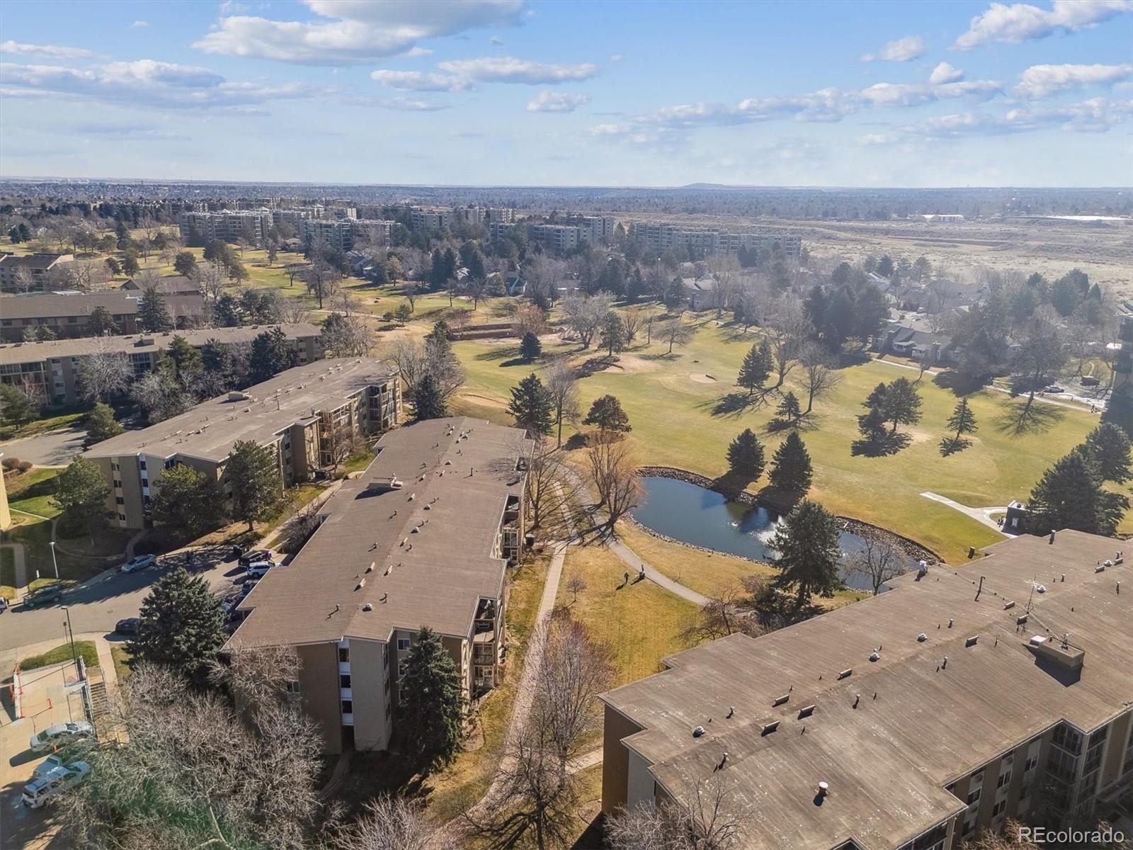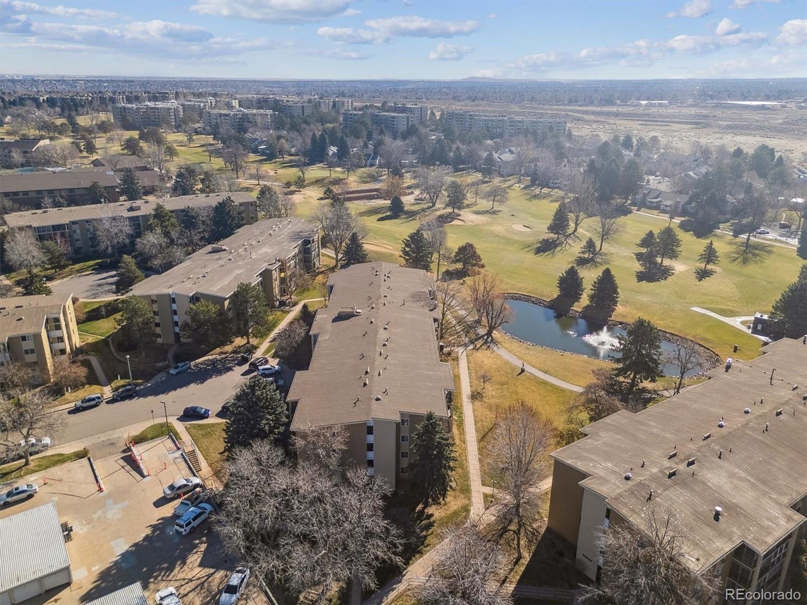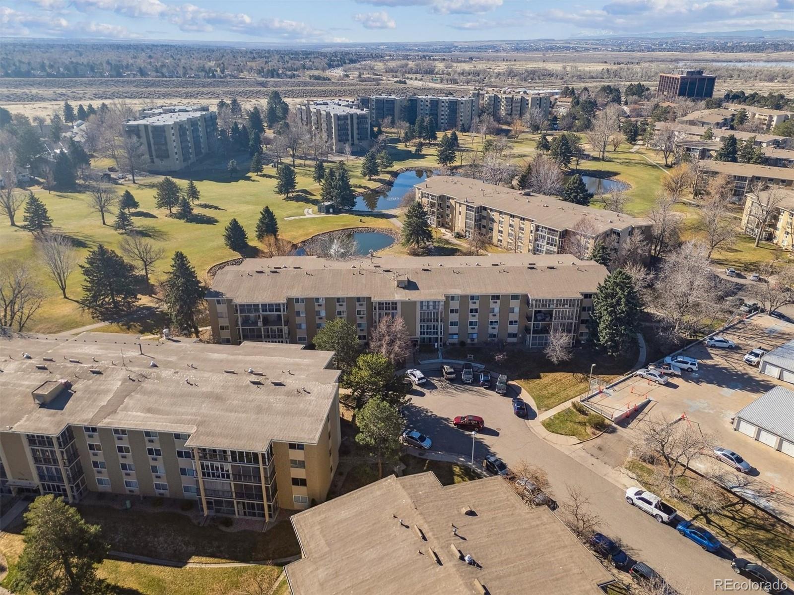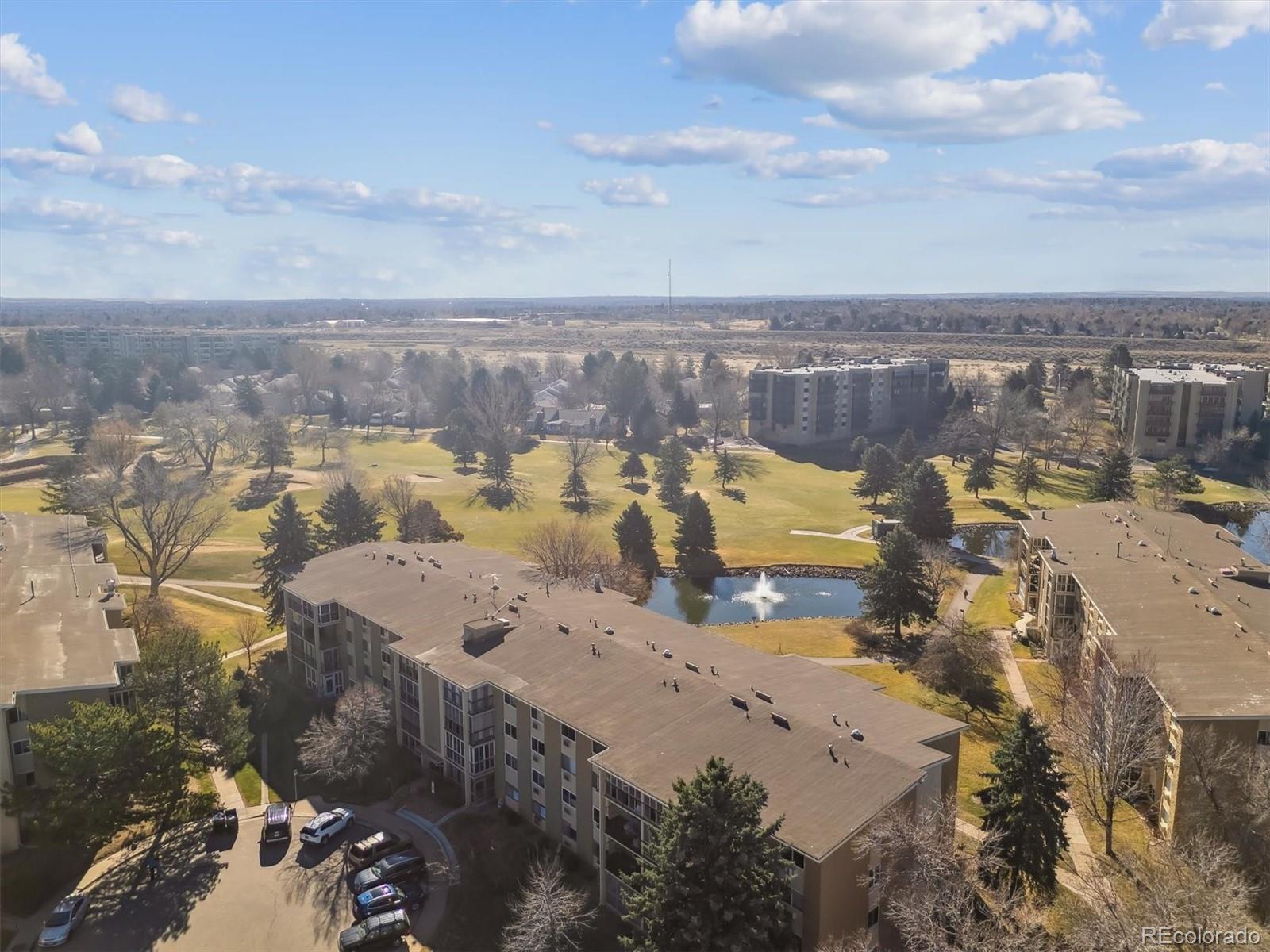 This is one of the best locations in Heather Gardens! overlooking the golf course and one of the beautiful ponds with a fountain. This Updated two bedroom two bath property features and updated kitchen with newer 42 inch cabinets with crown molding and under cabinet lighting. The lower cabinets have slide out shelves for ease-of-use. All kitchen appliances are newer and are included. The open floor plan has a large living room and dining area with additional built-in cabinets with slide out shelves. There is an additional bonus room that can be used for whatever your heart desires. This property features a large covered balcony with amazing West facing views of the golf course, pond and the beautiful Colorado sunsets. This Is a rare unit that enjoys two reserved covered parking spaces. It features a large primary bedroom with its own full private bath and walk-in closet.The Heather Gardens Community boasts a beautiful golf course, pool and hot tub. c;ubhouse, restaurant, tennis courts and so much more!