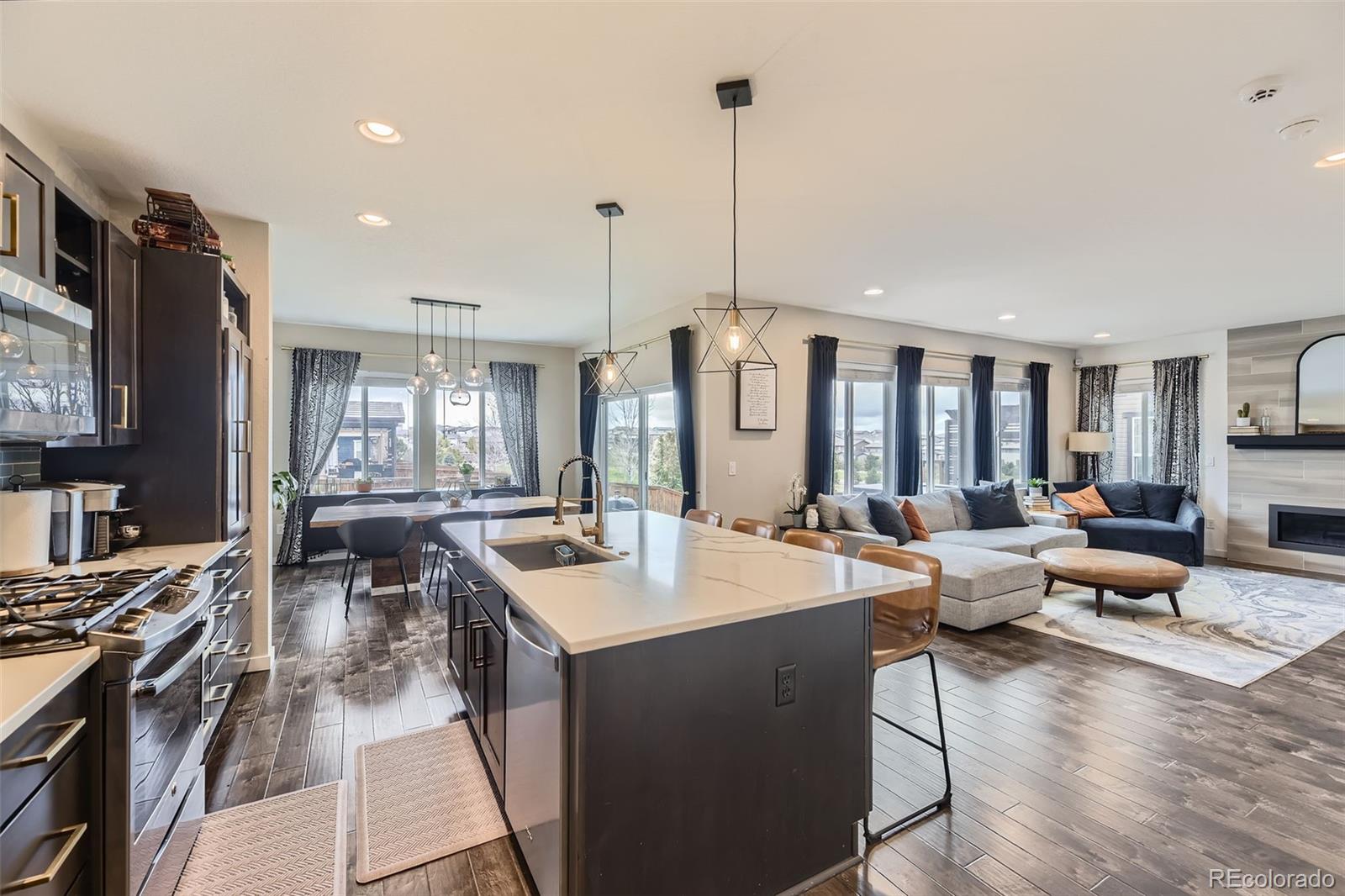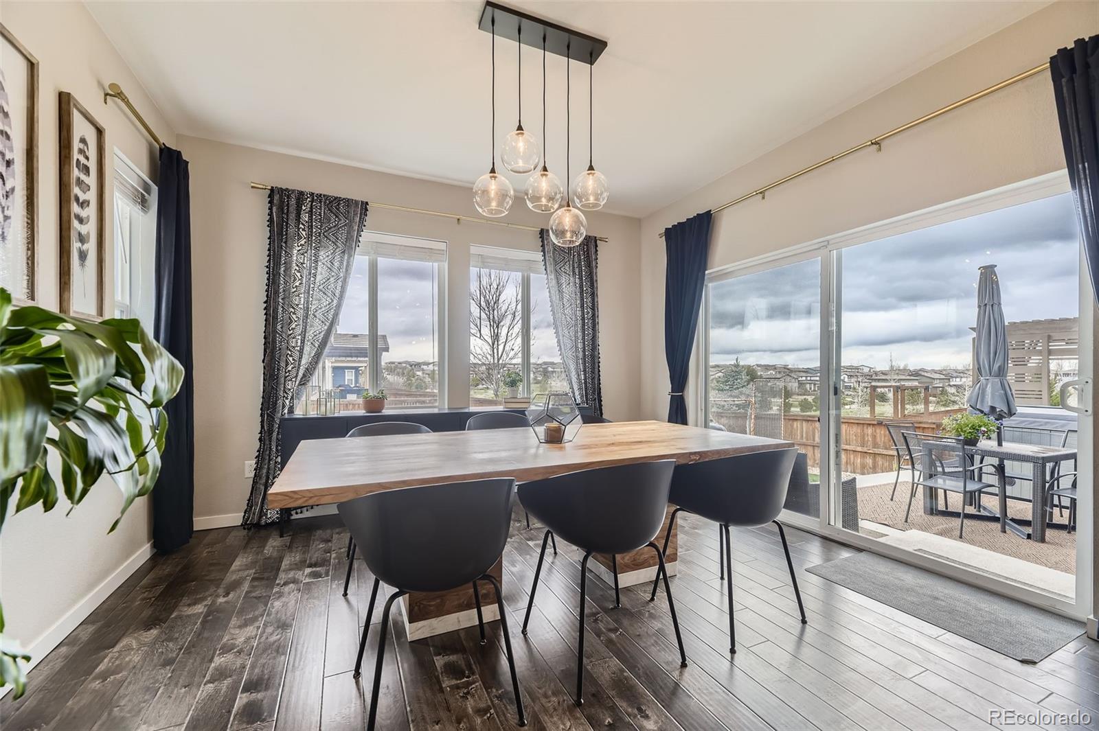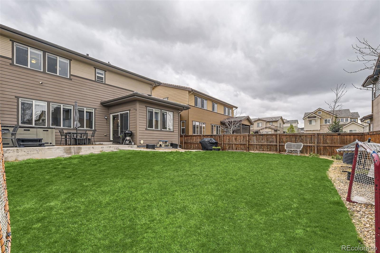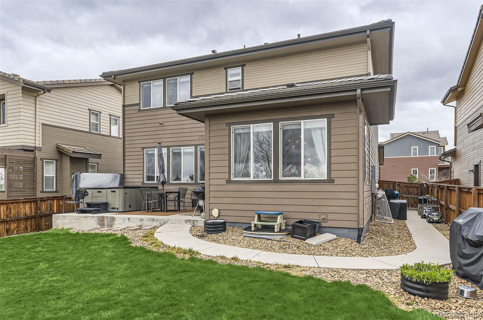 Truly all the features you look for in an amazing home! Plenty to love with this backyard that includes a 5-foot fence all the way around, west facing back patio with beautiful mountain views and enjoy watching the sunset from the 6-person hot tub. Custom floors flow throughout the main level which includes a dramatic entry with vaulted ceilings. This kitchen is a chefs delight complete with quartz countertops, massive center island, pantry, newer refrigerator, gas cooktop and top of the line stainless appliances. The light & bright dining room and spacious great room are perfect for all special occasions and cozy up by your gas fireplace. Also featuring a main floor executive study totally equipped for today's home office. Plenty to love with this luxurious primary suite featuring a sparkling custom bath and large walk-in closets. The laundry room is located on the upper level. The large open basement is ready to be finished, adding even more livable square footage. Professionally landscaped front and back complete with front porch and large backyard patio, perfect for outdoor BBQs and entertaining. Also featuring an east facing driveway for homeowners that don't enjoy shoveling snow! Walk to schools, parks and enjoy the greenbelt. Located near Parker Main Street with amazing shopping and dining. Easy access to 4-70, I-25 and DTC. Move-in condition and ready for the pickiest buyer. (((THIS IS THE ONE)))